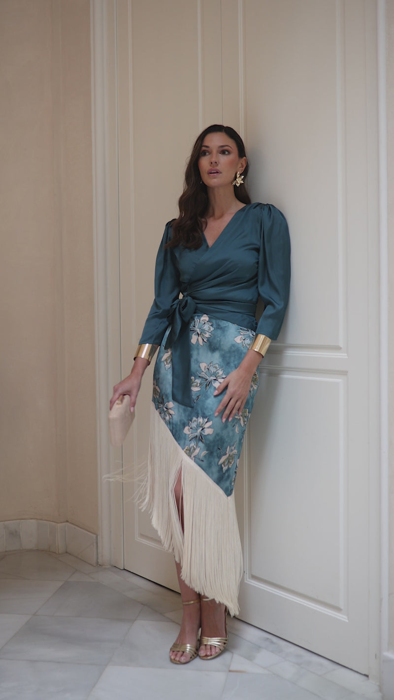 Se você está procurando um vestido de convidada com franjas, este é o seu vestido! com decote cruzado, laço que você ajusta ao seu gosto e aquelas franjas que clamam para você tirar para dançar.